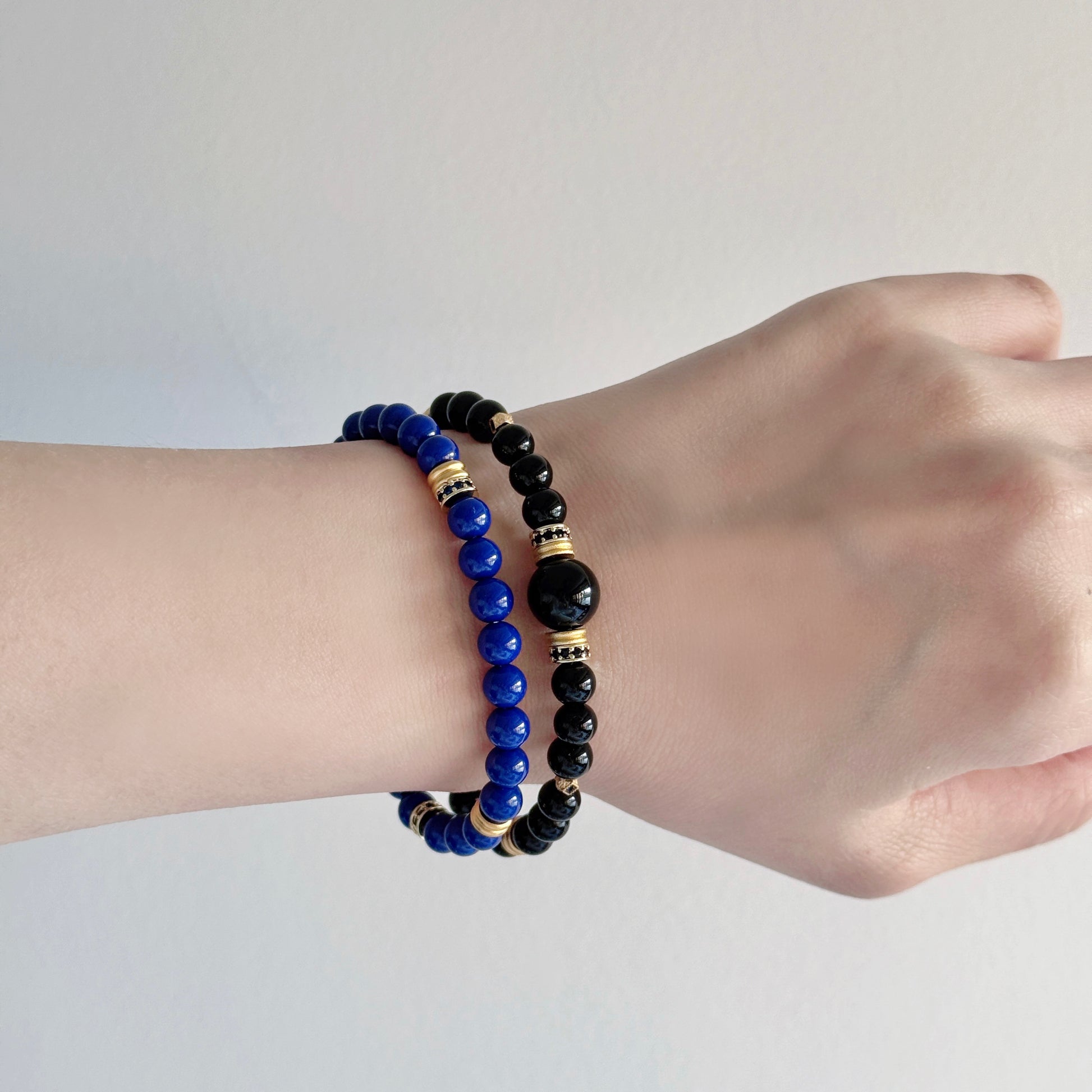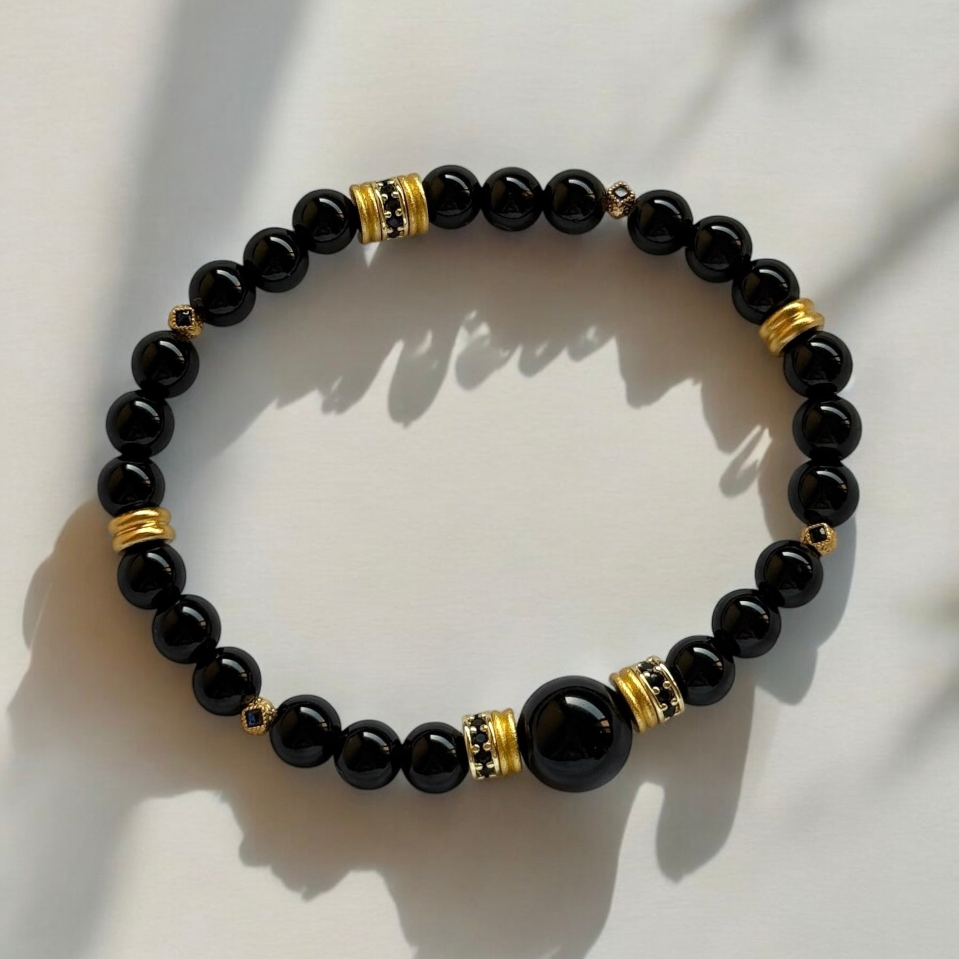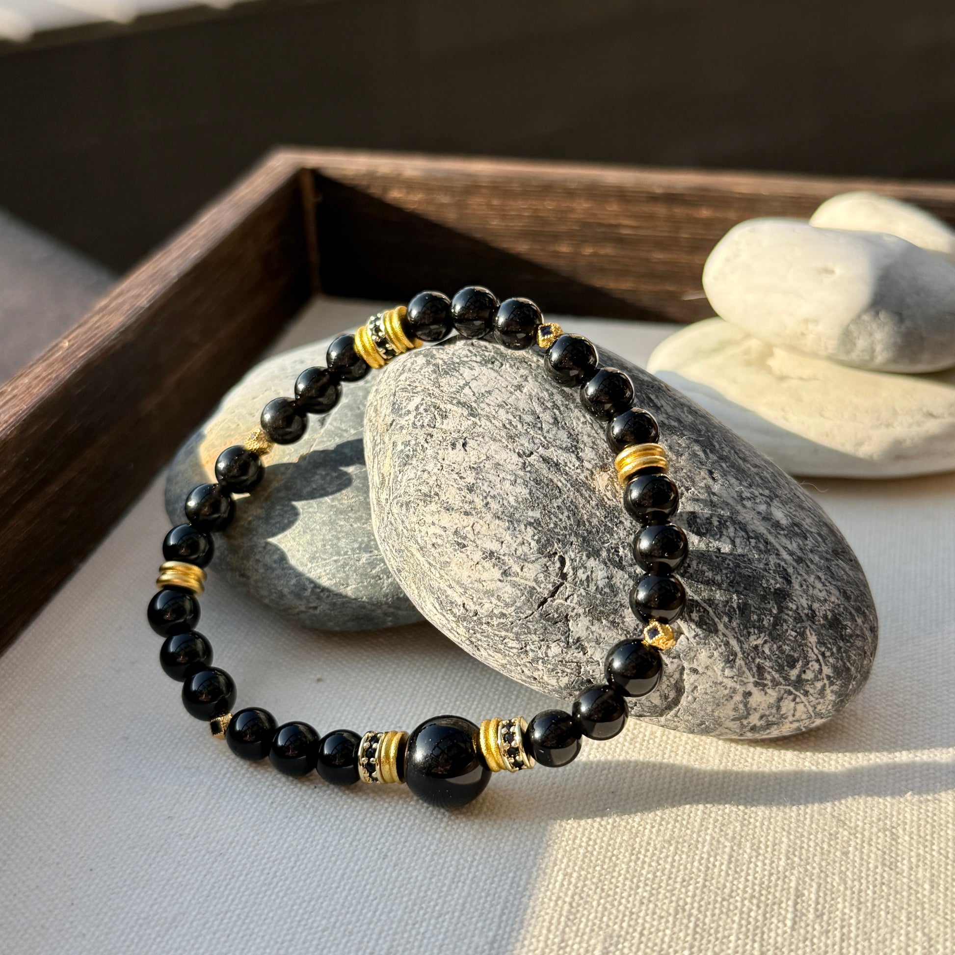 This bracelet features bold black obsidian beads, known for their protective energy and deep, sleek color. Obsidian is a stone of strength, grounding, and stability, often used to block negative energies and protect the wearer. It is also believed to promote emotional healing, helping to clear past emotional trauma and bringing peace and balance to the mind.