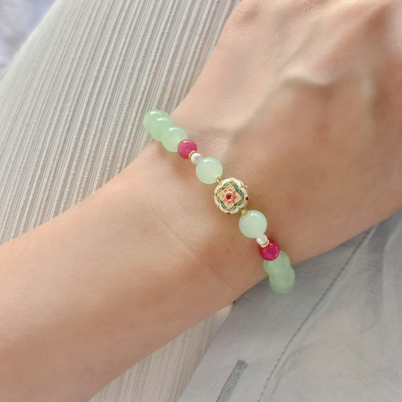 The Green Chalcedony is a symbol of vitality, balancing your emotions and promoting inner peace, while the Peach Pink Chalcedony nurtures emotional healing and harmony. The Pearls bring a touch of purity and spiritual protection.